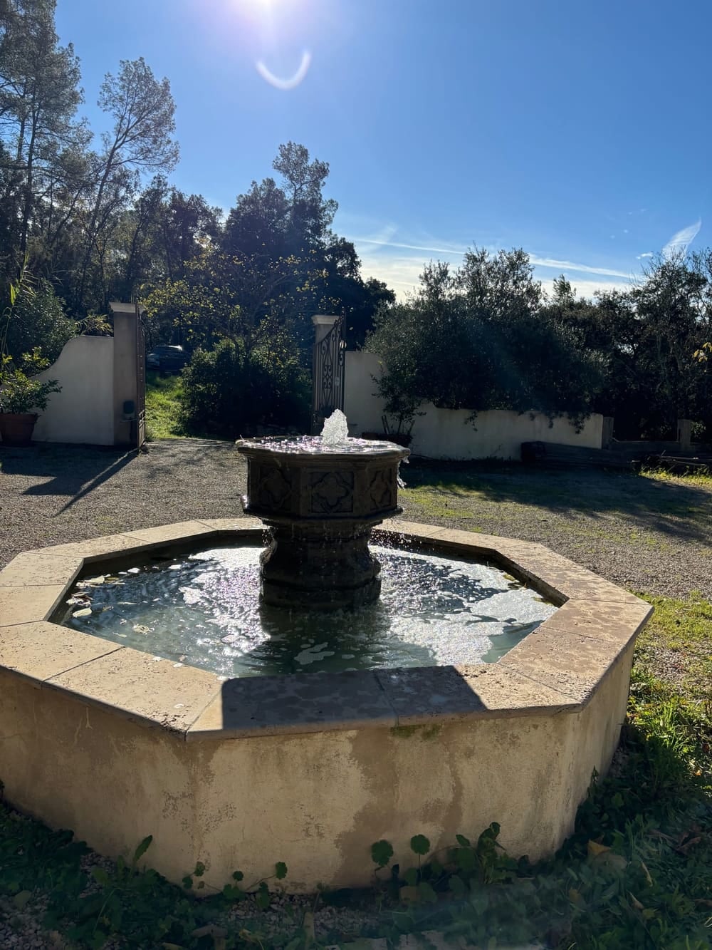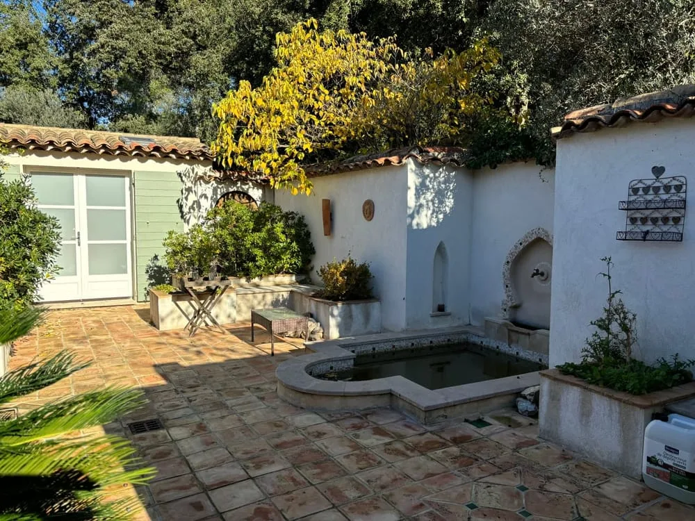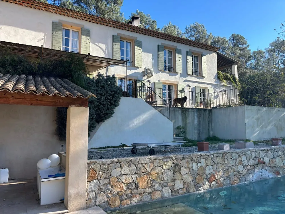 Son extérieur est arboré de chênes, de magnifiques terrasses en pierres et d'une très jolie piscine à débordement.