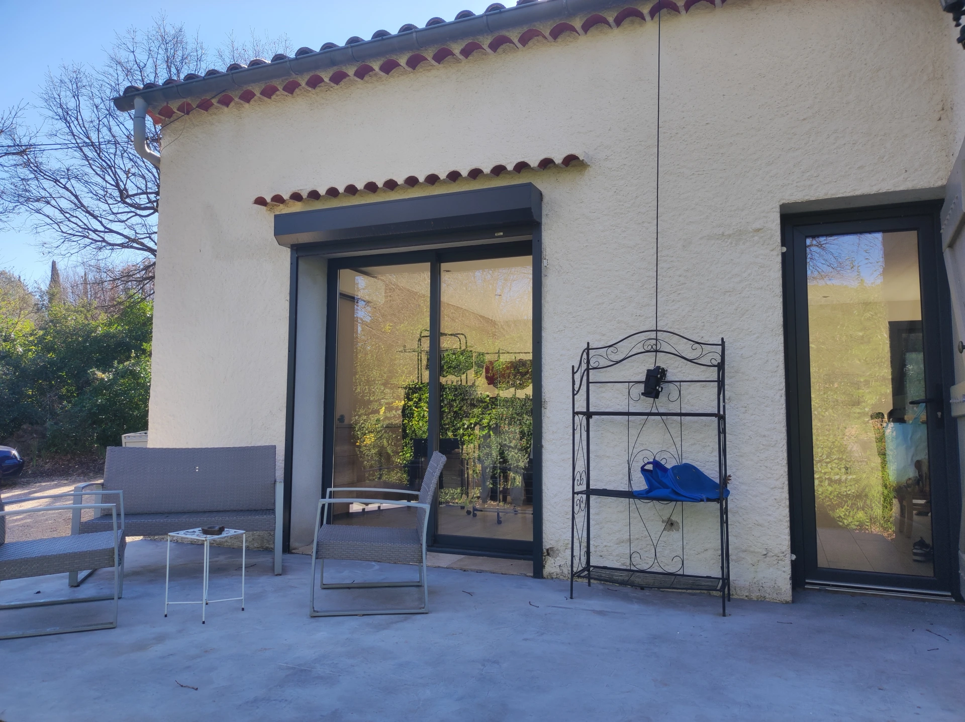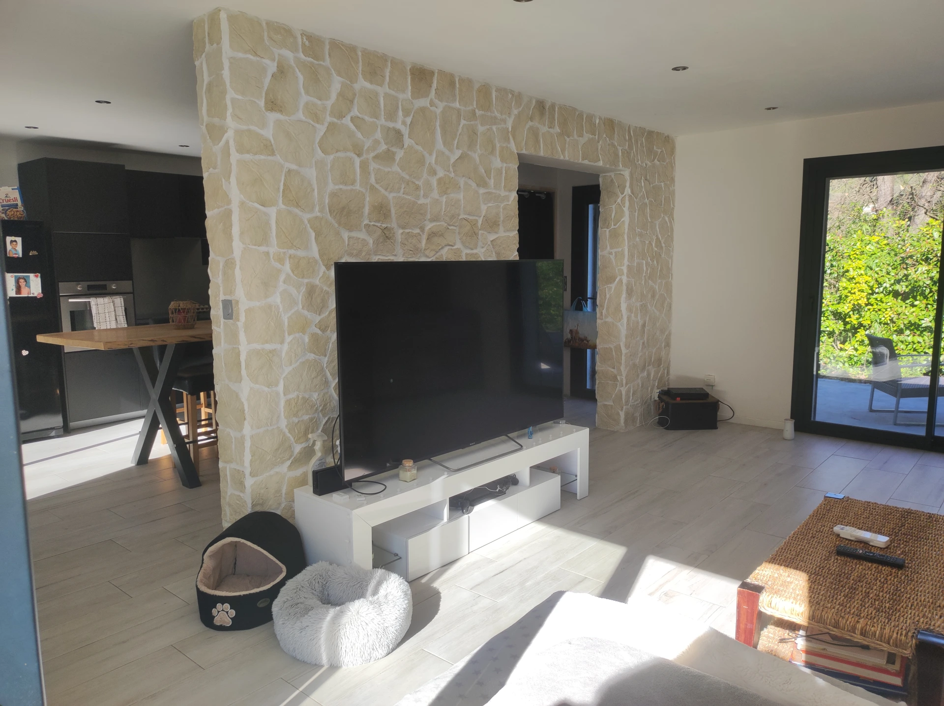 Cette maison est composée d’un séjour, d’une cuisine équipée avec une jolie table haute en chêne, de trois chambres, d’une salle de bains avec douche et d’un toilette indépendant.