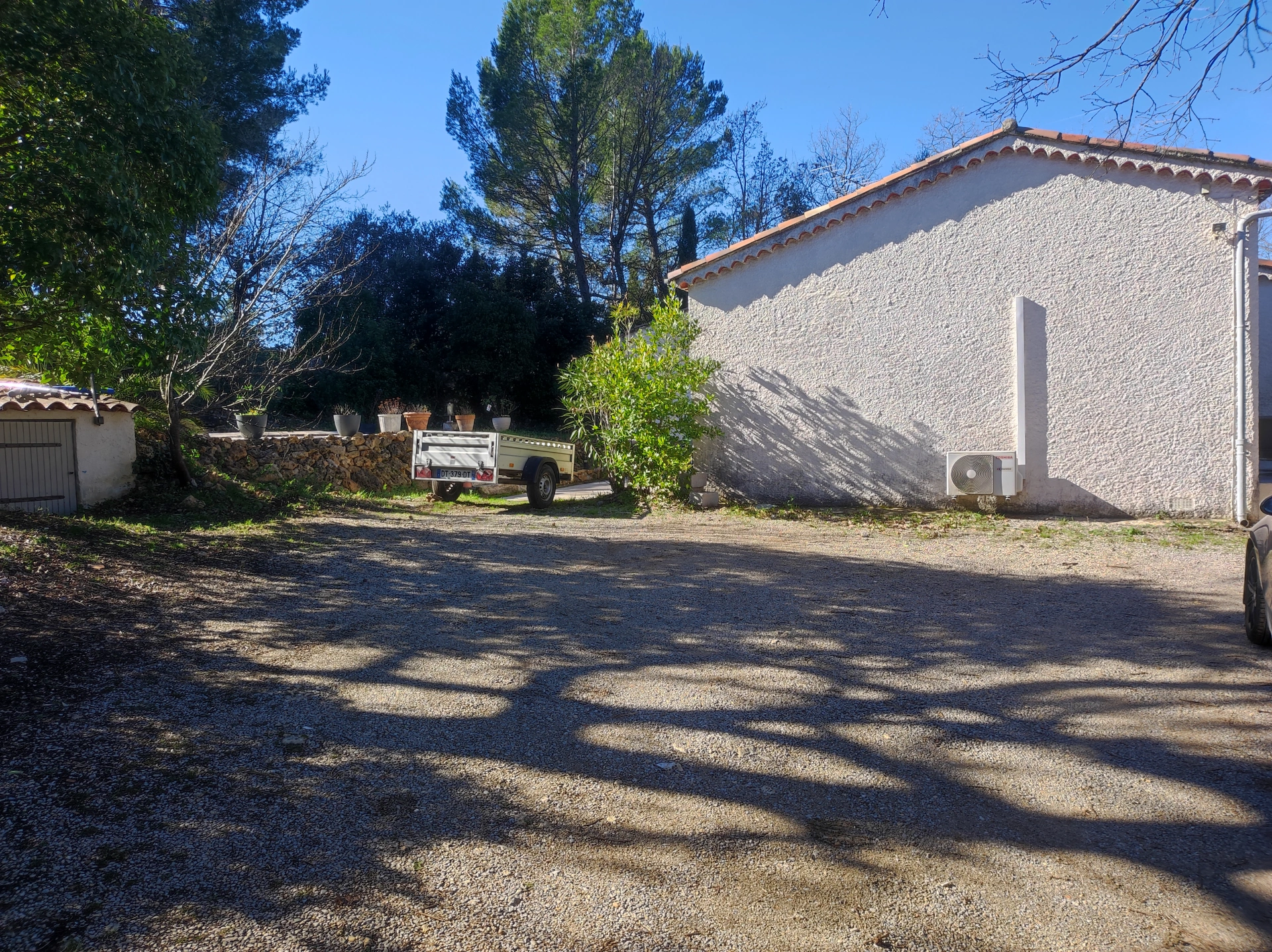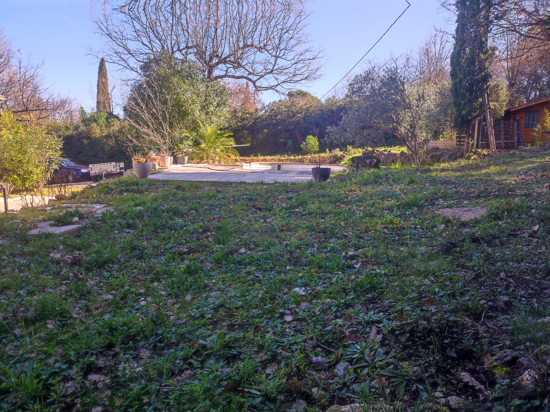 Le terrain de 1 540 m² est arboré et aménagé avec sa piscine, ses deux chalets en bois posés sur une dalle en béton et un abri de jardin.