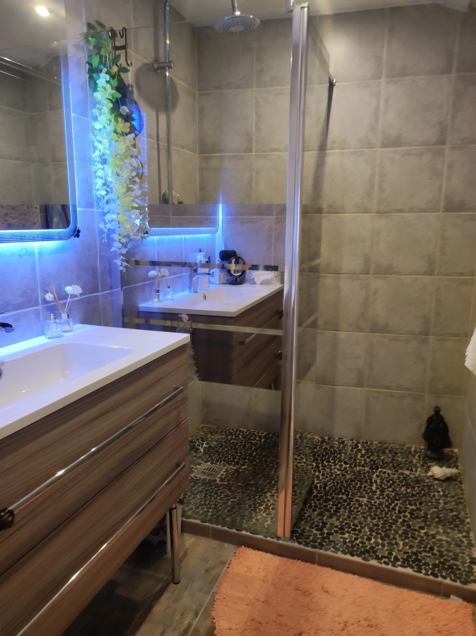 Vous avez un séjour avec coin cuisine, un toilette, et deux chambres au 2ᵉ étage, avec une jolie salle d’eau équipée d’une douche à l’italienne.