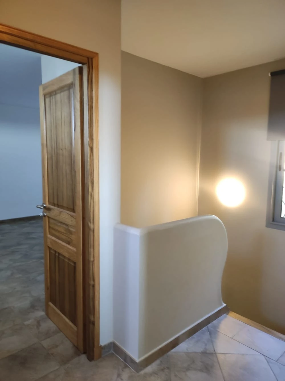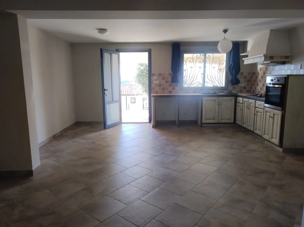 Au niveau supérieur, nous avons une entrée ouverte sur le séjour et sa cuisine équipée.